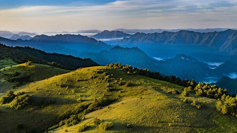 夏日的朝霞中,起伏的草甸仿佛一塊寬大無(wú)邊的綠色地毯,鑲嵌在大巴山上,如詩(shī)如畫。