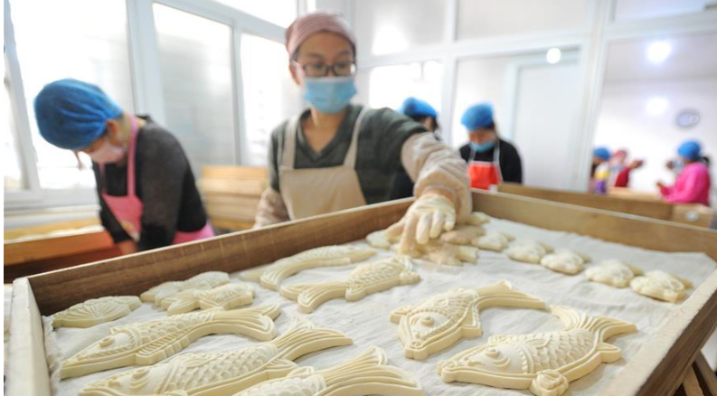 1月31日,河北黃驊市一家面花作坊的工人在查看面花。春節(jié)前夕,當(dāng)?shù)孛婊ㄖ谱鞴S加班加點制作面花,供應(yīng)春節(jié)市場。