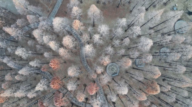 1月13日,霧散日升。河北省邢臺市大街小巷的樹枝上掛滿了潔白晶瑩的霜花,藍天下微風吹拂銀絲閃爍,奇麗壯觀。