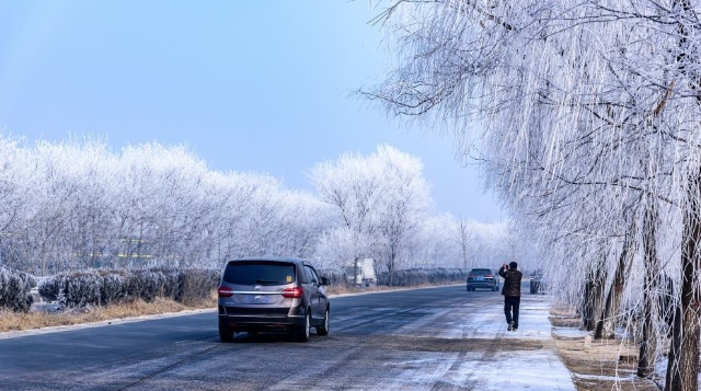1月13日,107國道河北省定州路段出現(xiàn)霧凇(樹掛)景觀,吸引路人駐足拍照留念。