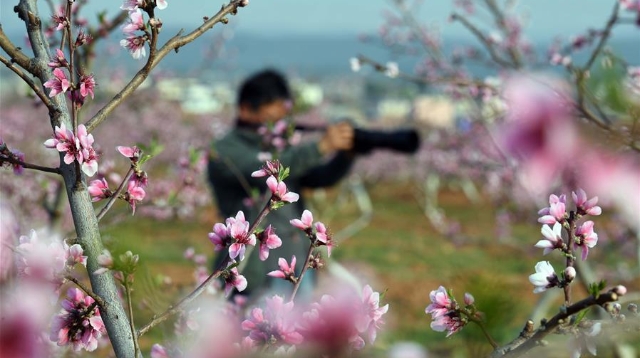 春季里,云南省曲靖市沾益區(qū)鄉(xiāng)村果園里的桃花梨花競(jìng)相綻放,景色秀美,吸引游人前來(lái)觀光。