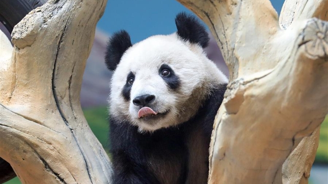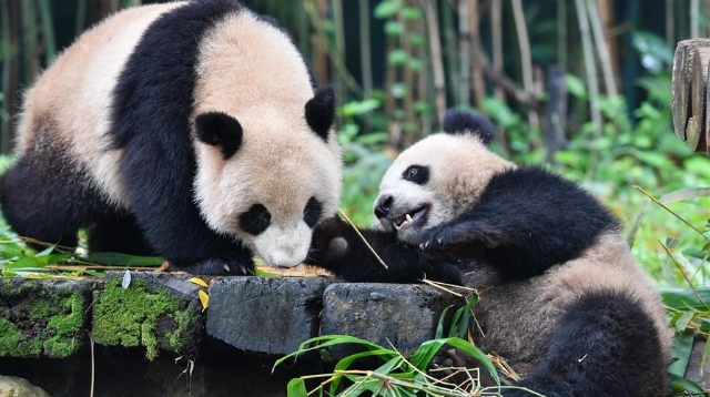 正在享受竹子大餐的廣州長隆野生動物世界大熊貓婷仔被大熊貓隆仔搶食,兩只大熊貓上演一場爭食戲碼。