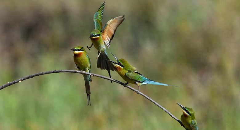 近日,百余只栗喉蜂虎和少量藍喉蜂虎來到海南省??谑形骱0抖鄠€地點棲息繁衍,為椰城增添一抹亮色。
