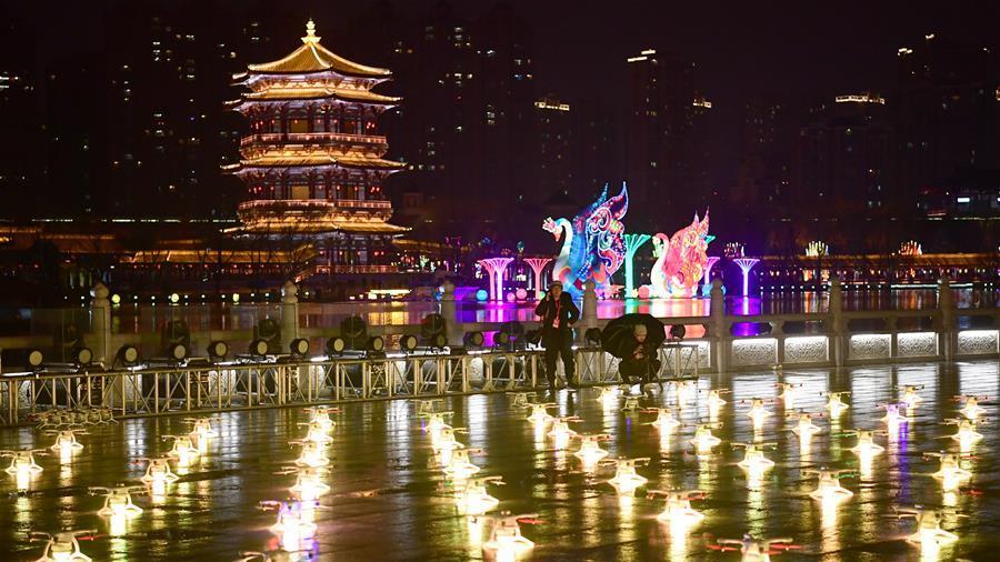 2月20日,300架無人機分為A、B兩組,通過動態(tài)飛行和燈光變化在空中展示出多種不同造型,為市民和游客帶來新奇的新春視覺盛宴。