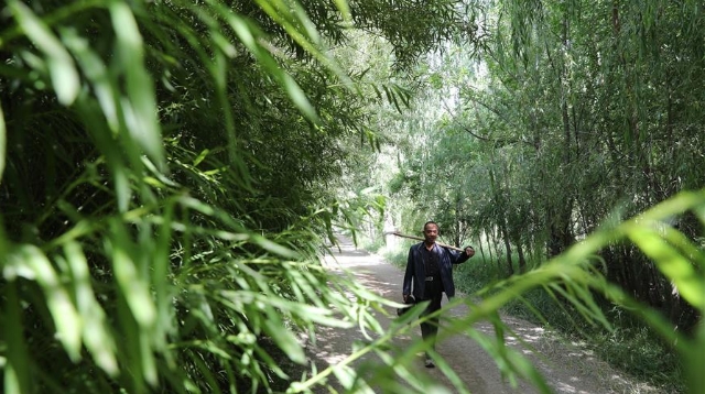 甘肅省金昌市永昌縣下四壩村村民徐文國(guó)走在林間小道上,兩旁的樹都是他15年前栽的(7月10日攝)。