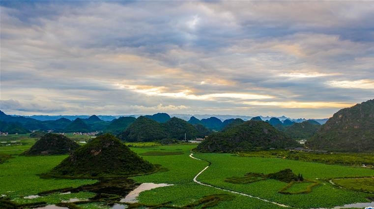 這是7月8日拍攝的普者黑國家濕地公園的夕陽景觀(無人機照片)。近日,云南省文山壯族苗族自治州丘北縣普者黑國家濕地公園山青水秀,風景優(yōu)美,吸引眾多游人前來觀光。