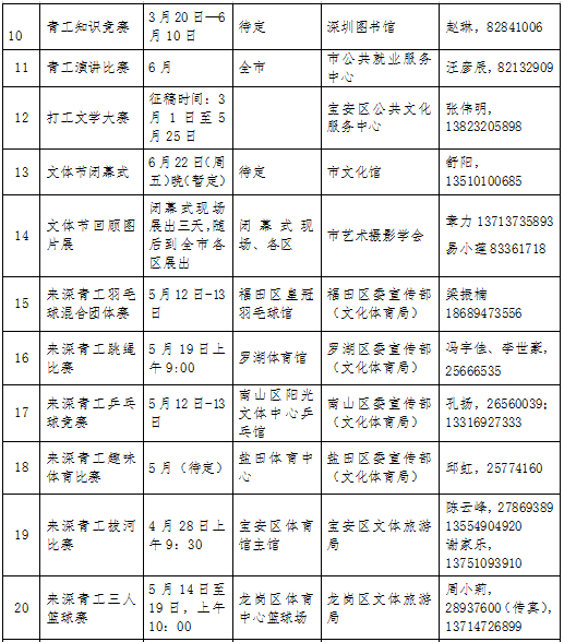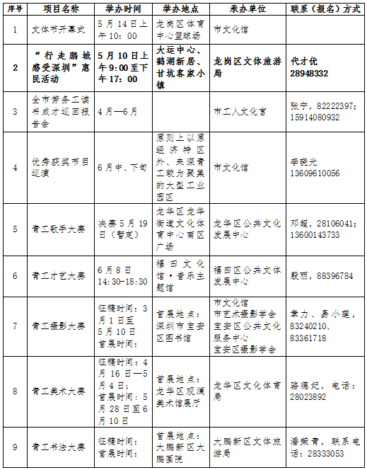 活動期間,全市將舉辦25項(xiàng)全市性重要活動,分為6項(xiàng)活動,19項(xiàng)比賽。其中,6項(xiàng)活動為開幕式、“行走鵬城 感受深圳”惠民活動、全市勞務(wù)工讀書成才巡回報(bào)告會、來深青工文體節(jié)回顧圖片展、閉幕式及優(yōu)秀獲獎節(jié)目展演;19項(xiàng)比賽活動分別是來深青工歌手大賽(全國)、才藝大賽、攝影大賽(全國)、美術(shù)大賽、書法大賽、知識競賽、演講比賽、打工文學(xué)大賽(全國)、羽毛球混合團(tuán)體賽、跳繩比賽、乒乓球競賽、趣味體育比賽、拔河比賽、三人籃球賽、業(yè)余定向賽競賽、登山比賽、棋類挑戰(zhàn)賽、趣味沙灘排球比賽、廣場健身操比賽。參賽對象主要為在深工作的18至50歲非深戶籍人士(不包括在各類文化演藝公司、培訓(xùn)機(jī)構(gòu)中從事文藝表演、培訓(xùn)的專業(yè)人員)。