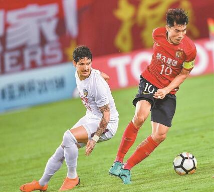廣州恒大隊(duì)球員鄭智(右)與天津權(quán)健隊(duì)球員帕托拼搶