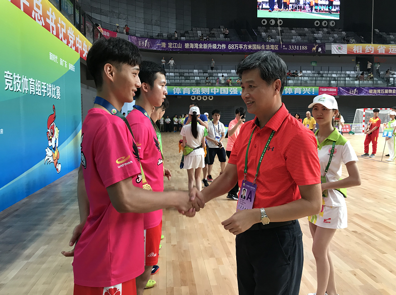 深圳新聞網(wǎng)訊 繼20日結(jié)束的高爾夫球賽奪冠后,深圳代表隊(duì)在廣東省運(yùn)會(huì)再下一金。7月21日,在為期5天的肇慶男子青少年組手球比賽中,深圳手球隊(duì)以35∶29打敗廣州隊(duì)奪得了冠軍,這是深圳男子手球隊(duì)在省運(yùn)會(huì)上獲得的第一個(gè)五連冠,也是深圳代表團(tuán)獲得的第一個(gè)集體項(xiàng)目金牌。深圳文體旅游局副局長韓星元現(xiàn)場為深圳男子青少年手球隊(duì)頒發(fā)金牌。