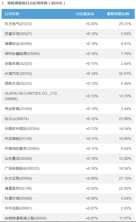 在2018年8月16日交易日內(nèi),東方電氣(01072)、百富環(huán)球(00327)、海螺創(chuàng)業(yè)(00586)港股通持股占比增加值最大,分別增加0.26%、0.18%、0.18%