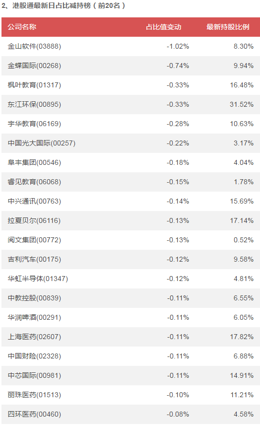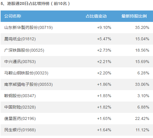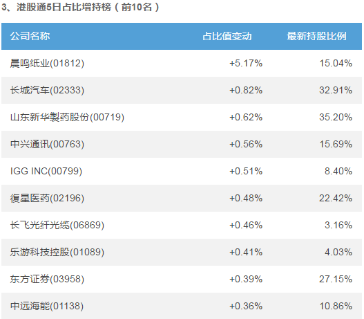 在最近5個(gè)交易日內(nèi),晨鳴紙業(yè)(01812)、長(zhǎng)城汽車(chē)(02333)、山東新華製藥股份(00719)港股通持股占比增加值最大,分別增加5.17%、0.82%、0.62%;金蝶國(guó)際(00268)、金山軟件(03888)、阜豐集團(tuán)(00546)港股通持股占比減少值最大,分別減少-1.26%、-1.25%、-0.86%。