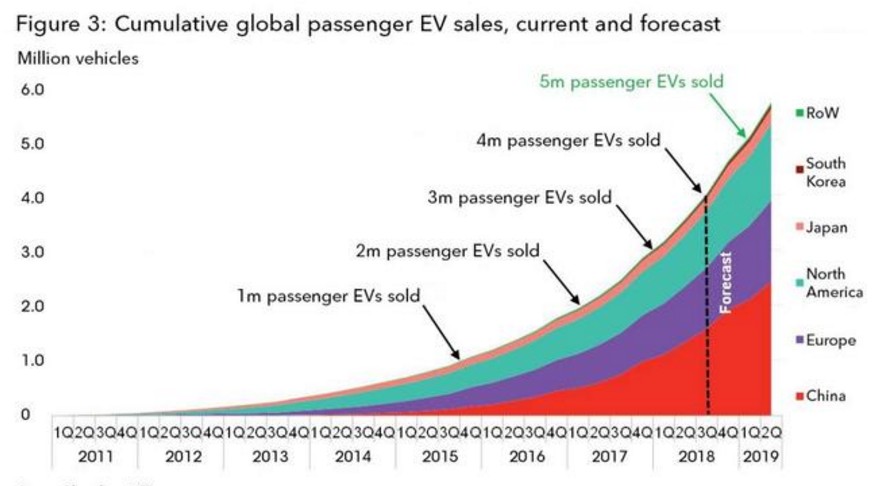 預(yù)計(jì)全球電動車?yán)塾?jì)銷量突破500萬僅需6個月時間,即到2019年3月份。未來電動車銷量的增長約42%的份額將會來自中國市場,而歐洲和北美則將分別貢獻(xiàn)26%和25%。(林淼)