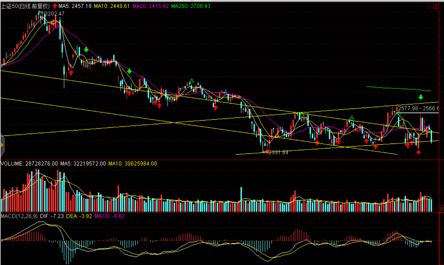 周一兩市股指全天震蕩下跌,股指均報(bào)收中陰線。上證50跌3.21%,創(chuàng)業(yè)板指跌1.01%。兩市僅成交2554億元,。盤面看白酒領(lǐng)跌大消費(fèi)白馬,茅臺(tái)跌停引發(fā)蝴蝶效應(yīng),食品、家電、醫(yī)藥聯(lián)袂大幅下跌,資金集中流出消費(fèi)白馬。