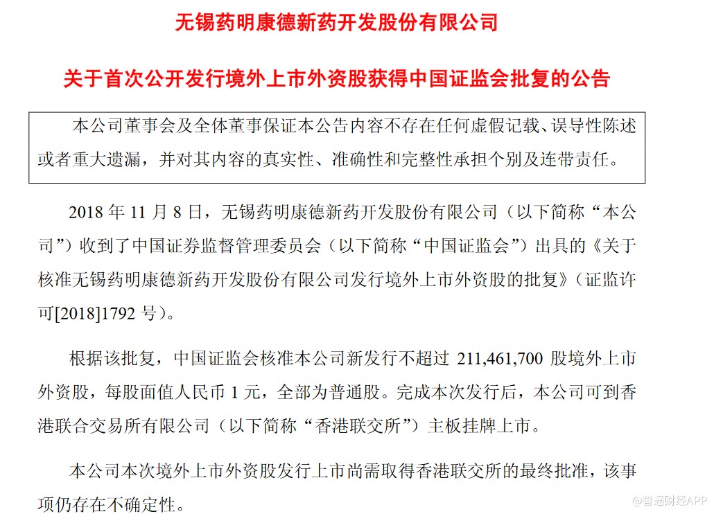 根據該批復,中國證監(jiān)會核準藥明康德新發(fā)行不超過2.11億股境外上市外資股,每股面值人民幣1元,全部為普通股。完成本次發(fā)行后,藥明康德可到香港聯(lián)交所主板掛牌上市。