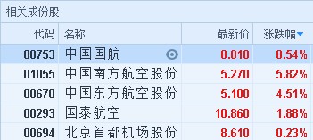 受益于國際原油價格下挫,航空股全線大漲。截至9時20分,中國國航(00753)漲8.54%,報價8.01港元,南方航空(01055)漲5.82%。