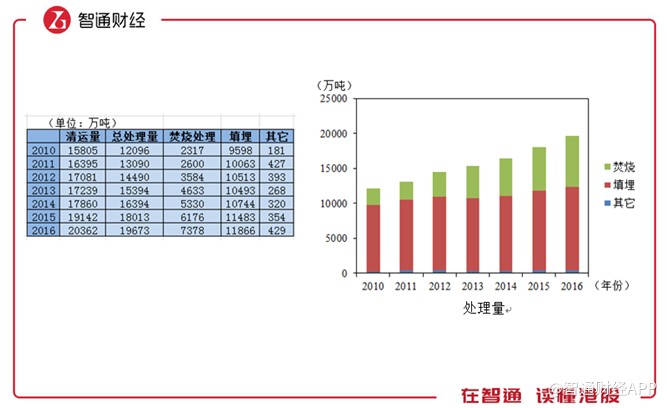 智通財經APP統(tǒng)計到,2010至2016年,生活垃圾清運量和處理量由15805、12096萬噸增長至20362、19673萬噸,無害化處理率由76.5%增至96.6%,可見垃圾處理率得到了明顯提高。