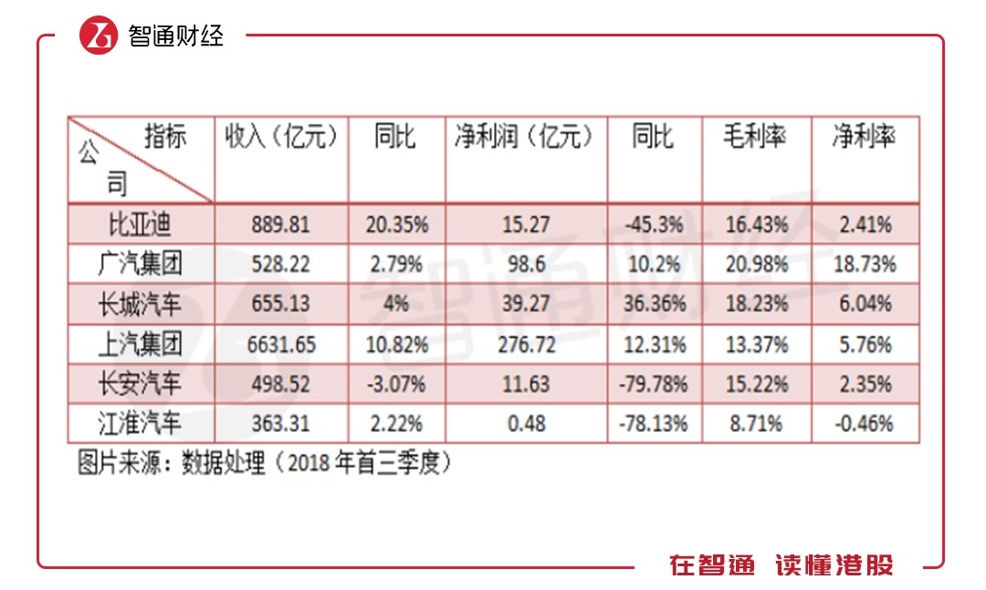 從抽樣的標(biāo)的看,2018年首三季度比亞迪(01211)的收入增速是最快的,其次是上汽集團(tuán),其余標(biāo)的增速單位數(shù)甚至是負(fù)增長,在此次標(biāo)的中,沒有自主品牌龍頭吉利汽車(00175),不過以該公司上半年的收入增速看,和比亞迪是同一個高增長賽道。在盈利上,各個車企差異還是挺大的,不過,在這塊操作靈活性較大。