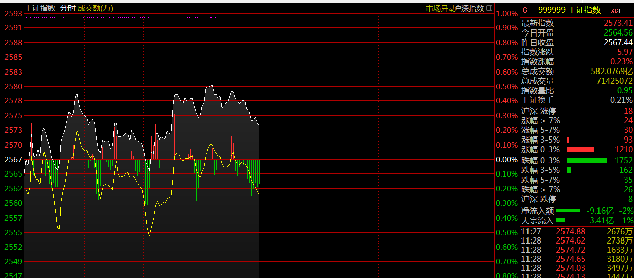 截至早盤收盤,上證指數(shù)報2573點,漲0.23%;深證成指報7602點,漲0.08%;創(chuàng)業(yè)板指數(shù)報1312點,跌0.01%。