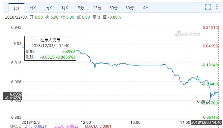 離岸人民幣亦收復(fù)6.9關(guān)口,升530,報6.8913。