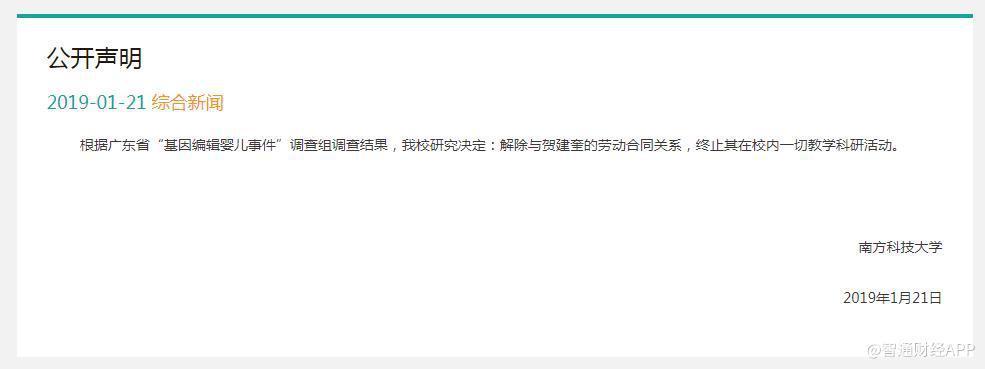 1月21日,南方科技大學發(fā)出公告稱,根據(jù)廣東省“基因編輯嬰兒事件”調查組調查結果,我校研究決定:解除與賀建奎的勞動合同關系,終止其在校內一切教學科研活動。