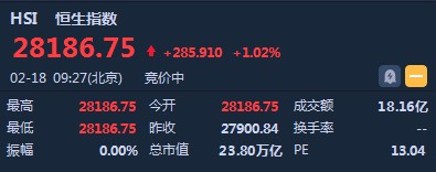 智通財經APP獲悉,恒生指數(shù)開盤漲285.91點或1.02%,報28186.75點。國企指數(shù)漲1.1%,報11057.72點。紅籌指數(shù)漲1.07%,報4499.71點。大市盤前成交18.16億港元。中美經貿高級別磋商結束。1月份社會融資數(shù)據(jù)超預期。
