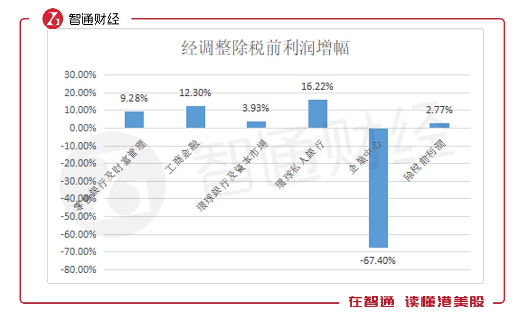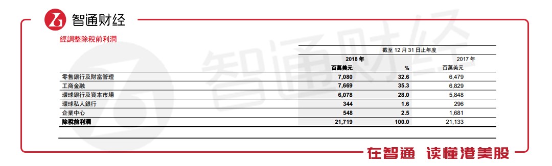 其中,由于利率上升、客戶增加以及英國和香港按揭業(yè)務(wù)實現(xiàn)逾200億美元增幅,帶動零售銀行及財富管理業(yè)務(wù)出現(xiàn)9.28%幅度的增長。然而,受四季度市場波動影響,財富管理業(yè)務(wù)經(jīng)調(diào)整收入較前三季度有輕微下降。