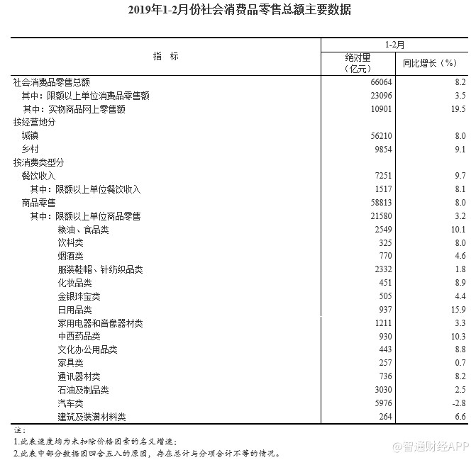 智通財(cái)經(jīng)APP獲悉,國(guó)家統(tǒng)計(jì)局公布,2019年1-2月份,社會(huì)消費(fèi)品零售總額66064億元,同比名義增長(zhǎng)8.2%,符合預(yù)期,但低于前值增長(zhǎng)9%。其中,限額以上單位消費(fèi)品零售額23096億元,增長(zhǎng)3.5%。