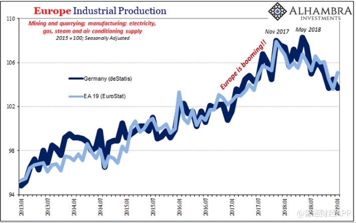 一個重要原因就是石油。美國國內(nèi)能源生產(chǎn)繼續(xù)推動整個行業(yè)。根據(jù)最新的估計,美國工業(yè)生產(chǎn)在過去幾個月,即2018年12月、2019年1月和2月出現(xiàn)整體下滑。相比之下,德國已經(jīng)增速放緩了至少9個月。
