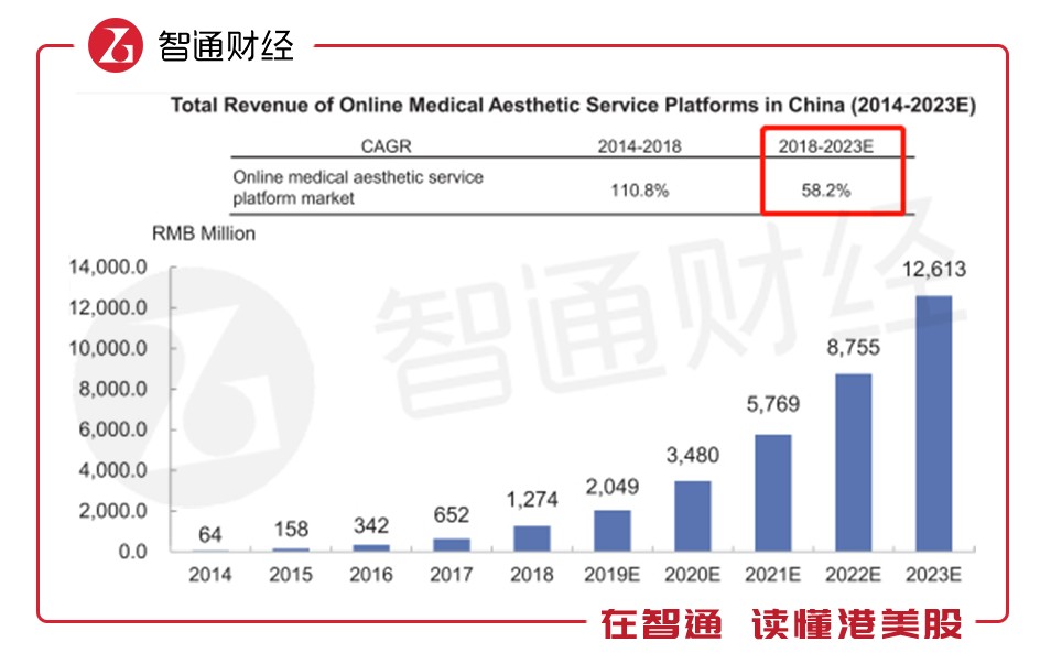 因此,近年來的線上醫(yī)美平臺憑借自身的優(yōu)勢快速崛起。從2018-2023年,線上醫(yī)美市場預(yù)計的年復(fù)合增長率為58.2%,遠(yuǎn)快于整體醫(yī)美市場的增長速度。