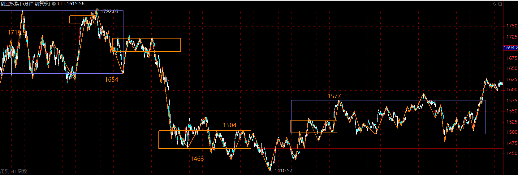 創(chuàng)業(yè)板這里在構(gòu)建30分鐘級別的三買,周一如果不跌破1577點,這里將是創(chuàng)業(yè)板主升行情的起點。如若重新跌回中樞內(nèi)部,則按中樞震蕩處理。創(chuàng)業(yè)板走勢要強于主板很多,后續(xù)行情多半仍然圍繞創(chuàng)業(yè)板展開。