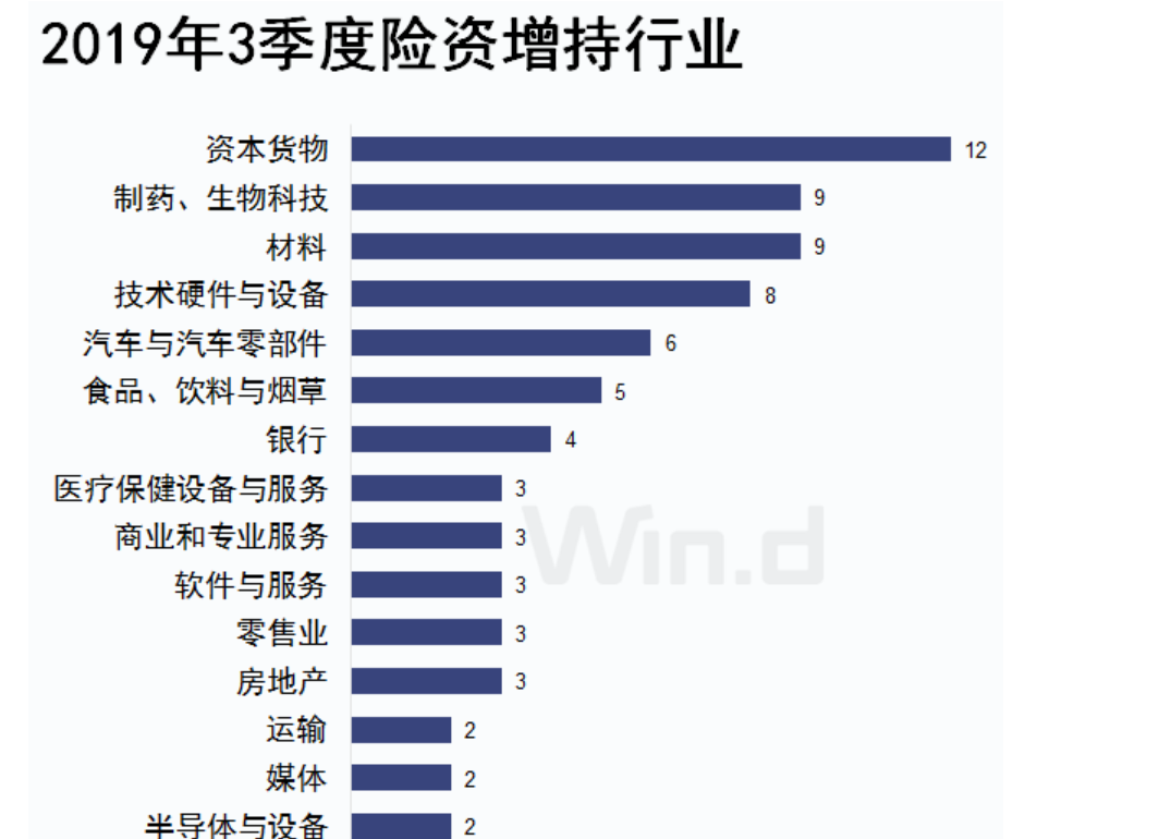 險(xiǎn)資財(cái)大氣粗,其一舉一動受到資本市場密切關(guān)注:據(jù)Wind數(shù)據(jù)統(tǒng)計(jì),截止2019年3季度末,兩市共有376家上市公司被險(xiǎn)資持有,持有股數(shù)約為833.21億股;132只保險(xiǎn)產(chǎn)品共持有約12380億元市值A(chǔ)股股票。資本貨物、醫(yī)藥、軟硬件、食品等獲重點(diǎn)增持。