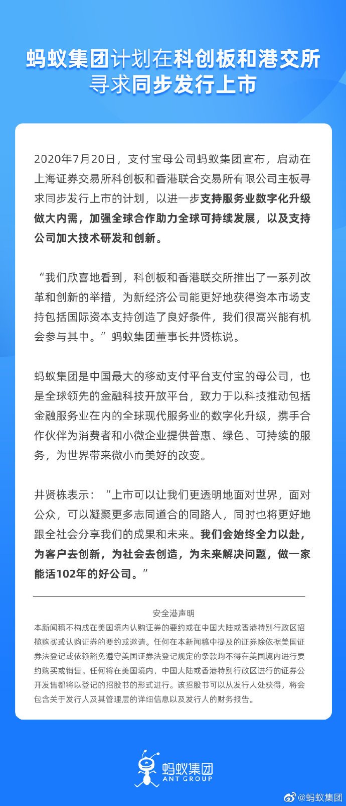 2020年7月20日下午,支付寶母公司螞蟻集團在官方微博宣布,該集團計劃在科創(chuàng)板和港交所尋求同步發(fā)行上市。
