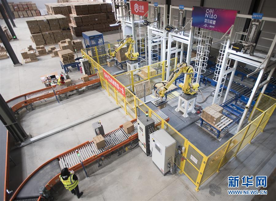??? 近日,在菜鳥網(wǎng)絡(luò)武漢黃陂物流倉內(nèi),一組機(jī)械臂在進(jìn)行搬運(yùn)作業(yè)。近日,菜鳥網(wǎng)絡(luò)在湖北武漢黃陂物流倉庫啟用智能機(jī)械臂來搬運(yùn)商品。據(jù)介紹,每組機(jī)械臂一個(gè)小時(shí)能搬運(yùn)1000件商品,可以24小時(shí)不間斷作業(yè)。這些機(jī)械臂的投入,有助于緩解高峰期貨物處理壓力,提高發(fā)貨速度,被工程師親切地稱為“麒麟臂”。新華社記者肖藝九攝