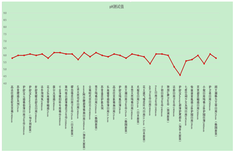 女性特殊時期的抗病能力大大降低,而與皮膚密切接觸的衛(wèi)生巾的酸堿度即pH值是關(guān)乎女性特殊時期健康的重要因素。據(jù)婦幼保健醫(yī)生介紹,衛(wèi)生巾的pH值在弱酸性至堿性對人體最安全。本次比較試驗35款衛(wèi)生巾pH值測試結(jié)果均在4.5到6.5之間,對人體無害。pH值測試結(jié)果見下圖。