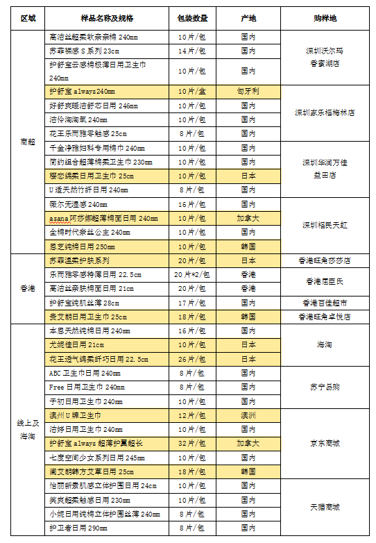 據(jù)前期調(diào)研發(fā)現(xiàn),國外品牌衛(wèi)生巾更受女性消費者青睞,很多消費者認(rèn)為國外品牌衛(wèi)生巾質(zhì)量更優(yōu)更值得信賴,進而選擇跨境或海淘等方式購買國外產(chǎn)品。因此,本次樣品分別從深圳商超、香港、線上海淘購買樣品進行測試和比較,樣品涉及11款國外原裝產(chǎn)品。詳見下表。