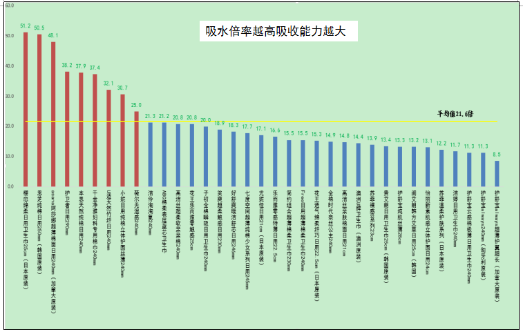 測試結(jié)果顯示,35款衛(wèi)生巾樣品吸水倍率最高達(dá)到51.2倍(櫻戀綿柔日用衛(wèi)生巾,日本原裝),最低為8.5倍(護舒寶always超薄護翼超長,加拿大原裝)。對于需要解決經(jīng)期量多量大問題的女性消費者可以優(yōu)先選擇吸水倍率高的衛(wèi)生巾商品。無論選擇哪種吸量衛(wèi)生巾,婦幼保健醫(yī)生建議,衛(wèi)生巾最佳更換時間為2-3小時。測試結(jié)果詳見下圖。