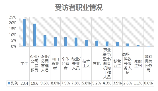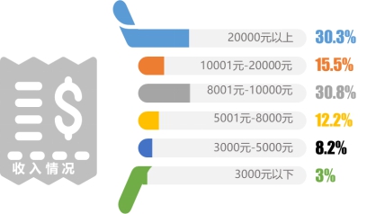 本次調(diào)研中,學(xué)生的比例最高,為23.4%,其次是企業(yè)/公司一般職員,占比為19.6%。76.9%的受訪者其個(gè)人月收入超過8000元。