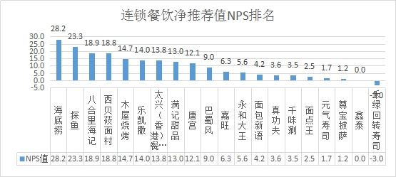 在本次調研中,20個連鎖餐飲品牌包括三類:中式正餐(海底撈、探魚、八合里海記、西貝筱面村、木屋燒烤、太興(香港)餐廳、唐宮、巴蜀風、千味涮)、中式快餐(嘉旺、永和大王、真功夫、面點王)、特色餐飲(樂凱撒、滿記甜品、面包新語、元氣壽司、尊寶披薩、鑫泰、禾綠回轉壽司)。整體的平均凈推薦值為9.4分。排名第一的是海底撈,凈推薦值為28.2分;其次是探魚,凈推薦值為23.3分;第三名是八合里海記,凈推薦值為18.9分。