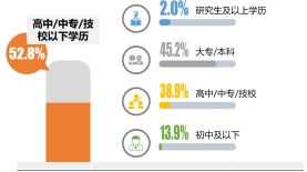 本次調研中,連鎖餐飲消費者中,23歲-30歲是主要消費者,占比36.1%,30歲以下的消費者占比為65.7%。52.8%的受訪者學歷為高中/中專/技校及以下 。