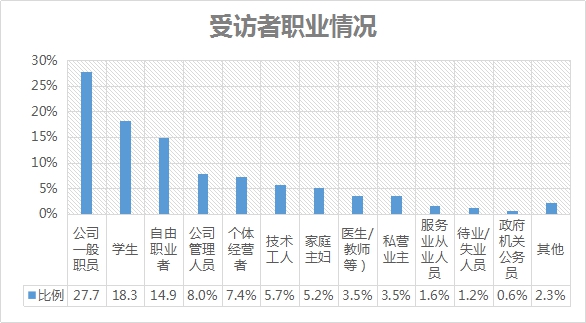 本次調研中,公司一般職員的比例最高,為27.7%,其次是學生,占比為18.3%。53.9%的受訪者其個人月收入超過5000元。
