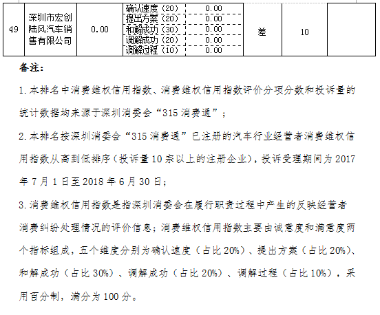 在細分指標方面,深圳市標域汽車有限公司、深圳標特汽車(集團)有限公司和深圳市宏創(chuàng)陸風汽車銷售有限公司等27家企業(yè)處理投訴不及時,未積極與消費者先行和解,導致其企業(yè)“確認速度”、“提出方案”和“和解成功”三項分項指標的分數(shù)皆為0,嚴重影響了企業(yè)的消費維權信用指數(shù)和信用等級。深圳市仁孚特力汽車服務有限公司、深圳市安進汽車貿易有限公司和深圳市大興寶譽汽車銷售服務有限公司在由消委會工作人員評分的“調解過程”分項指標分數(shù)為負分,3家企業(yè)存在不配合調解甚至拒絕調解的情況,解決消費糾紛的誠意度較差;另外,深圳市宏創(chuàng)陸風汽車銷售有限公司的消費維權信用指數(shù)為0,誠意度和滿意度為0,10宗消費投訴皆未處理成功,排名最后。