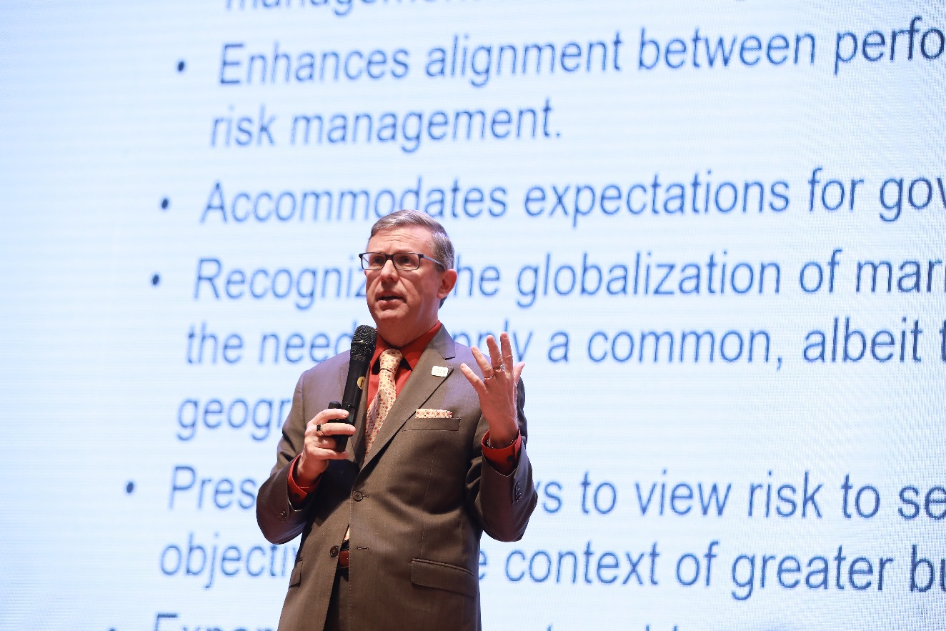 IMA總裁兼首席執(zhí)行官 Jeffrey Thomson以“企業(yè)風險管理——風險與戰(zhàn)略和績效協(xié)調(diào)一致”為主題,圍繞美國反虛假財務報告委員會下屬的發(fā)起人委員會C OSO的企業(yè)風險管理最新框架,與現(xiàn)場嘉賓分享了企業(yè)風險管理所需要注意的問題。Thomson表示,風險管理并非單一孤立,而應當貫穿于戰(zhàn)略制定、績效考核、內(nèi)部控制等企業(yè)管理的方方面面。他強調(diào),風險管理并非是“杜絕”風險,而更重要的是確定風險偏好,管控風險的同時分析發(fā)現(xiàn)企業(yè)發(fā)展的機遇。