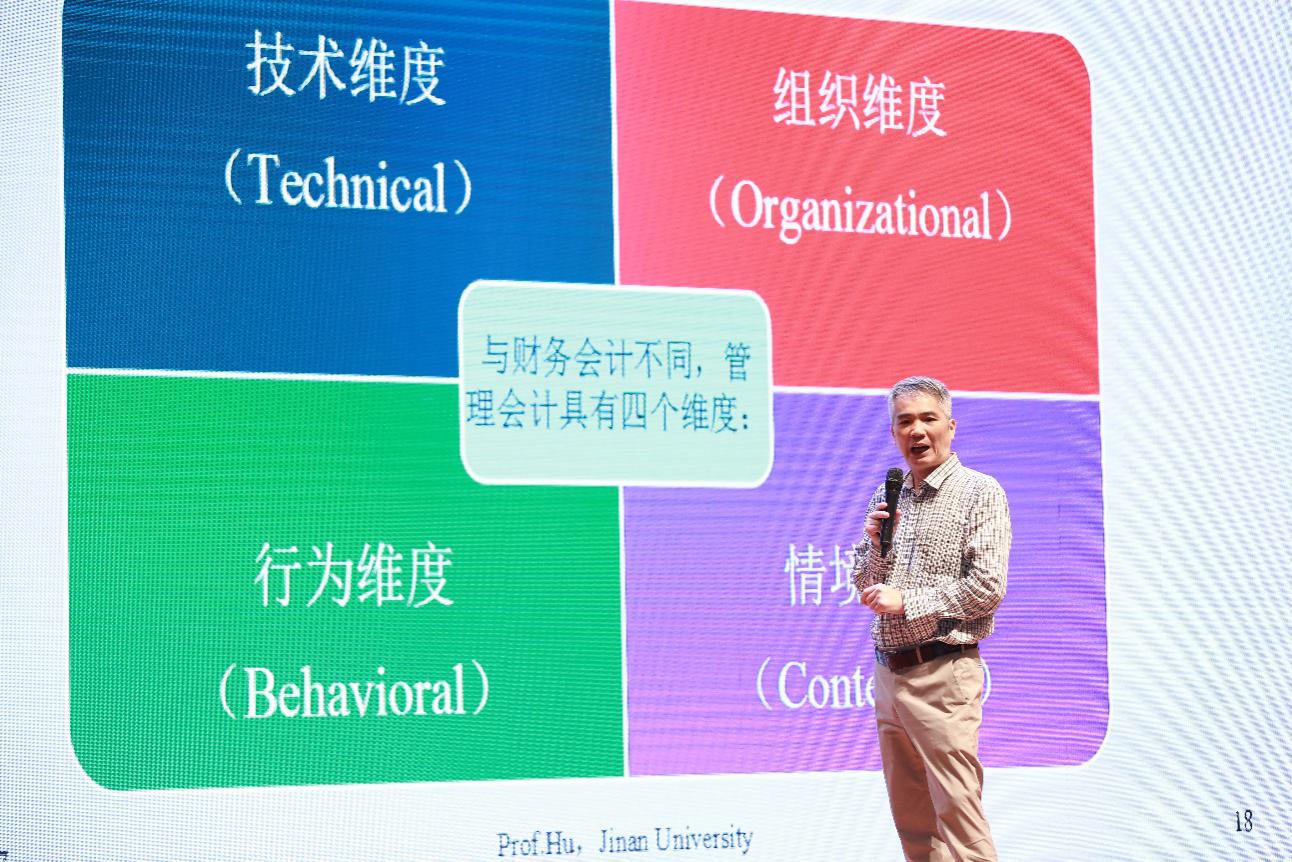 下午,暨南大學會計系教授胡玉明以“管理會計如何‘由技入道’”為題,首先分析了管理會計與財務會計有何不同,并深入淺出的剖析了大智移云背景下,管理會計的提升關(guān)鍵在于分析對數(shù)字背后意義。他強調(diào),會計人員對大數(shù)據(jù)等新科技挑戰(zhàn)不應當恐慌,反而應當成機遇,提升數(shù)據(jù)分析能力。