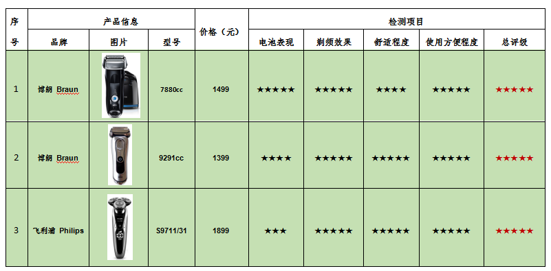 在本次比較試驗(yàn)中,電動(dòng)剃須刀剃須效果綜合評(píng)分最高的是飛利浦 Philips S9711/31,其次是博朗 Braun9291cc;舒適程度方面,飛利浦 Philips S9711/31表現(xiàn)最佳,松下 Panasonic ES-LT2得分最低;而在使用方便程度上博朗 Braun9291cc得分最高,其次為飛利浦 Philips S9711/31;在電池表現(xiàn)上,充滿電后可使用時(shí)間最長(zhǎng)的是博朗 Braun7880cc (3小時(shí)12分鐘),以使用一次五分鐘來算,大約可使用30次左右;充滿電后可使用時(shí)間最短的是松下 Panasonic ES-LT2(0小時(shí)33分鐘)。