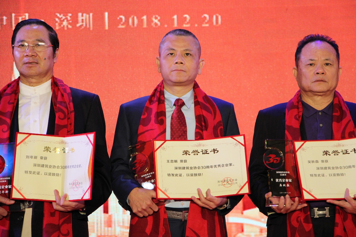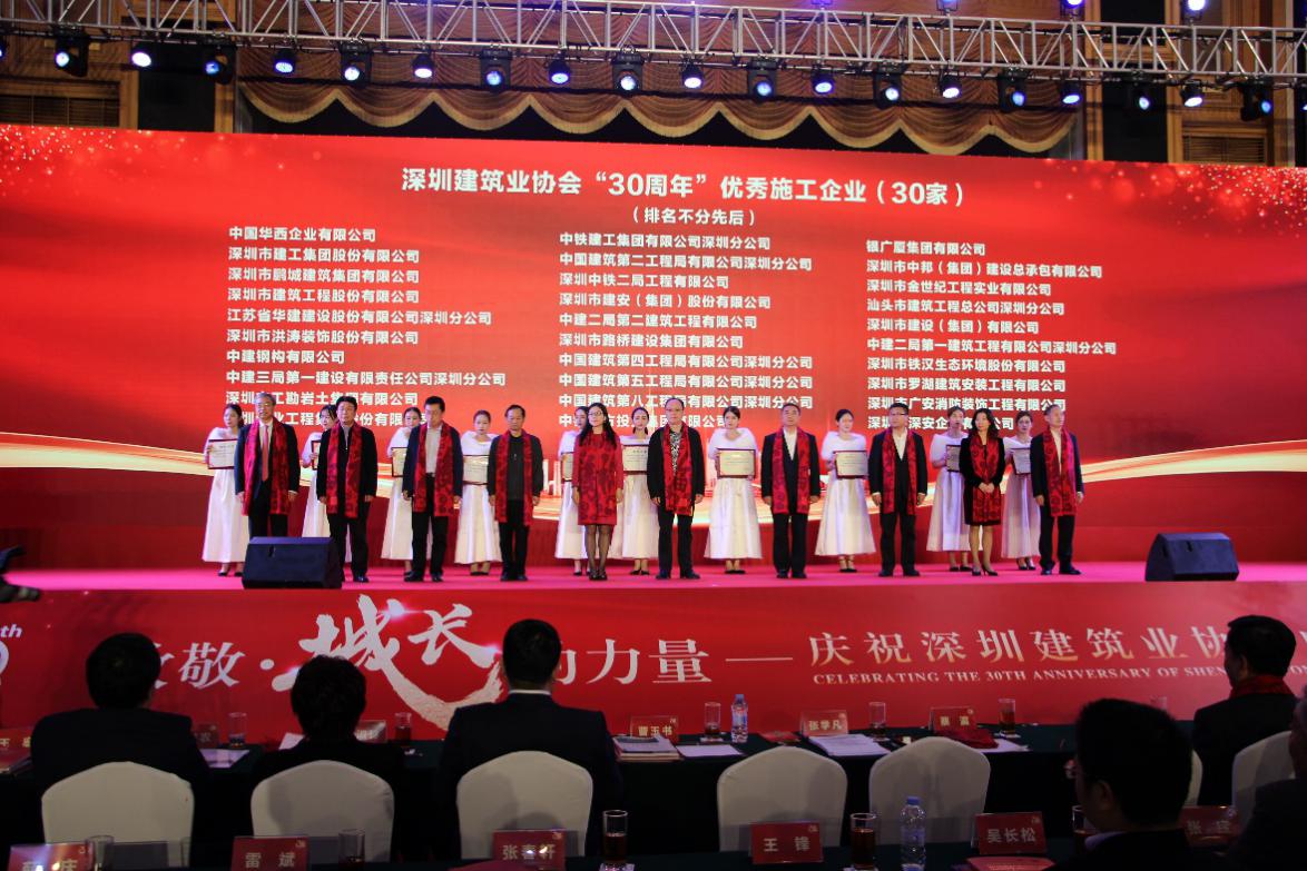 本次慶典上,深圳建筑業(yè)協(xié)會表彰了一批在促進、推動深圳建筑行業(yè)發(fā)展中作出重大貢獻(xiàn)的優(yōu)秀企業(yè)和個人,鼓勵他們不斷探索創(chuàng)新,共同創(chuàng)造深圳建筑業(yè)的輝煌。深圳市建被授予“30周年優(yōu)秀施工企業(yè)”;翠林投資集團董事長王忠明榮獲深圳建筑業(yè)協(xié)會“30周年優(yōu)秀企業(yè)家”稱號;深圳市建員工盧燦光、郝崇民榮獲“30周年優(yōu)秀項目經(jīng)理”稱號;深圳市建老員工李炳坤榮膺“30周年優(yōu)秀工匠”稱號。