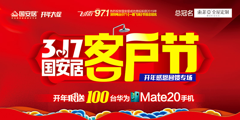 國安居一直心懷感恩,感謝十多年來累計30萬老客戶的信賴與支持,此次活動不僅是為了品牌優(yōu)惠,更多的是給老客戶送去關(guān)懷和福利。國安居特聯(lián)合深圳電臺971王牌節(jié)目一路飛揚鼎力巨獻,聯(lián)手旗下百位工廠總裁打造開年大促,推出多重優(yōu)惠:1、開年狠送100臺華為mate20手機;2、聯(lián)購滿額返100萬現(xiàn)金,上不封頂?shù)瘸祷仞伝顒?,?.15為契機來回饋多年來關(guān)注國安居、支持國安居的廣大消費者,以最大限度的優(yōu)惠、最為超值的實惠、最為驚喜的鉅惠獻禮3.17大促!