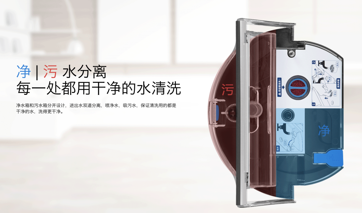 ILIFE智意W400所采用的大容量?jī)粑鬯浞蛛x設(shè)計(jì),隨時(shí)確保只用凈水洗地,極大地提升了清潔效果。