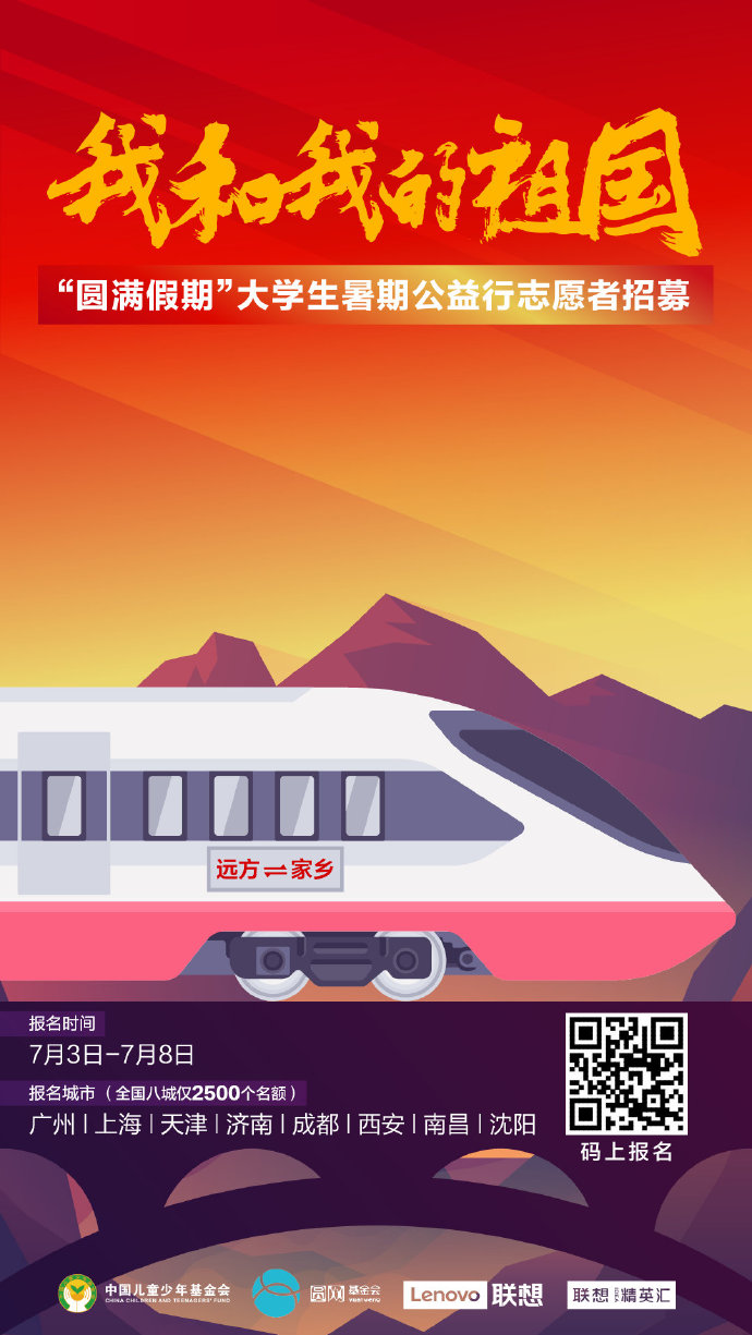 7月3日,由中國兒童少年基金會、北京圓網(wǎng)慈善基金會和聯(lián)想集團共同發(fā)起的“‘我和我的祖國’圓計劃—圓滿假期大學生暑期公益行”活動,面向全國8個城市的大學生正式開啟志愿者招募,邀請回鄉(xiāng)大學生加入到為廣大留守兒童群體量身定制的公益行動中,幫孩子團圓、為孩子圓夢、讓愛心圓滿。對于大學生來說,這將是一次獨特的公益實踐經(jīng)歷。