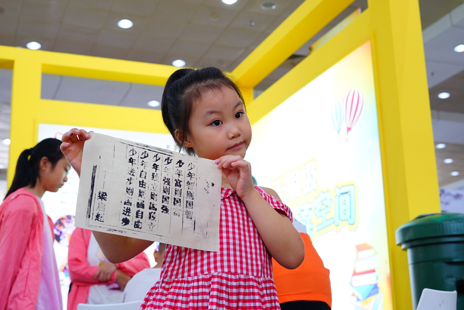 有了一系列視覺沖擊,現(xiàn)場(chǎng)還鼓勵(lì)大家動(dòng)動(dòng)手,“活字印刷”區(qū)和“手工布書”體驗(yàn)區(qū)也是不容錯(cuò)過。體驗(yàn)涂墨、拓壓等工序,活字印刷術(shù)聽就聽得多了,小朋友見還是第一次見,還有機(jī)會(huì)親自體驗(yàn)一番,感受濃濃書香氛圍。印刷的內(nèi)容節(jié)選自江門籍思想家、教育家梁?jiǎn)⒊膼蹏?guó)散文《少年中國(guó)說》。