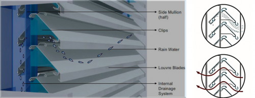 除了屋面幕墻的“防水神經(jīng)系統(tǒng)”,令人驚嘆的還有安裝在展館立面幕墻上的“人字形”百葉,這種雙片百葉同時(shí)具備50%“空氣通風(fēng)性能和95%防雨水性能。巧妙的“人字形”設(shè)計(jì),使得風(fēng)和雨水從百葉片間進(jìn)入時(shí),能夠保證空氣從向上傾斜的第一片百葉有效進(jìn)入,而雨水被第二片向下傾斜的百葉擋住,并由葉片分流至兩邊的豎框里,排出下邊框。“人字形”百葉不僅能完全阻風(fēng)防雨,還具備超高強(qiáng)度,足以抵抗臺風(fēng)暴雨的侵襲。